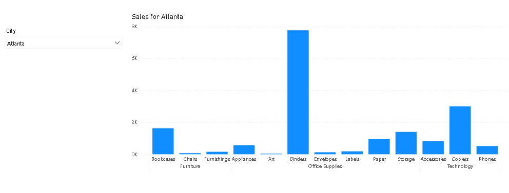 The management requested to make the title on the bar graph dynamic in nature. So let's dig deep into how can we build dynamic titles for your visuals. I am considering Sample Superstore data. The use case is to create a stacked column chart with a slicer of the city on the page. On the X axis, we are taking Category and Sub Category and on the Y axis, we are taking Sales amount. Now, if you see the title of the column chart it's static and doesn't change with the selection in the slicer. To make it dynamic in nature we will create a simple measure.