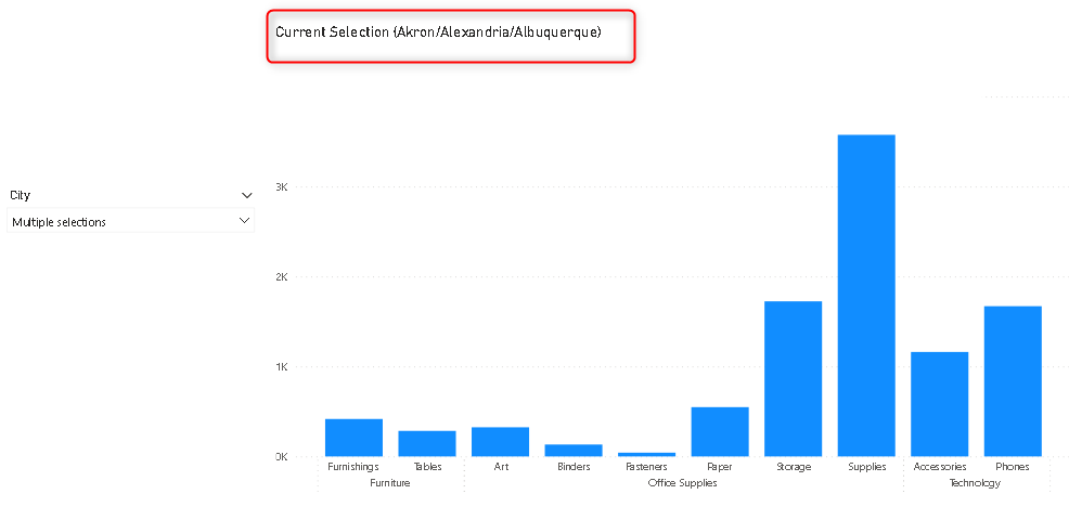 As mentioned in the above image we have selected the measure in the field section. Click on OK and you can see if you select any of the cities it will show the city name in the visual. If you clear the selection in the slicer the title will show "Sales for the US".