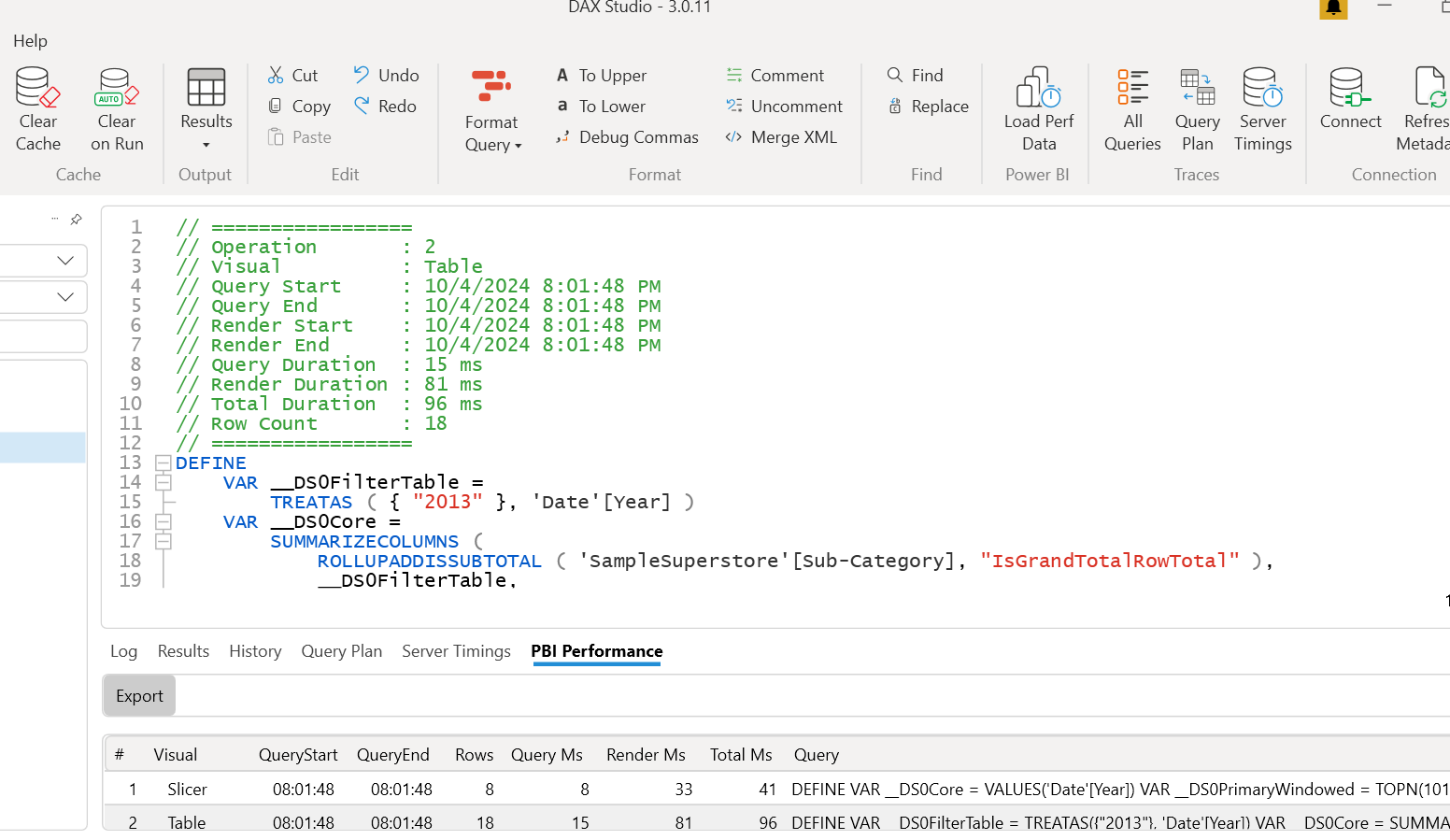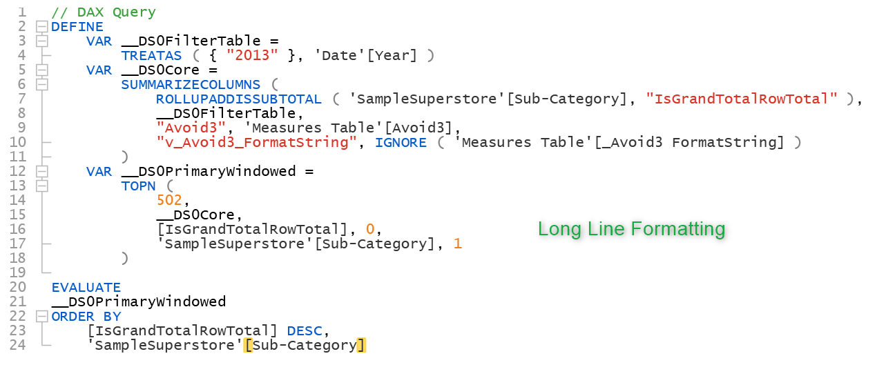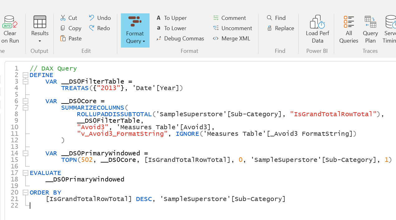 If you are beginner in writing queries in DAX Studio then visit this doc from DAX Studio on writing basic DAX queries. Let me help you understand what this query is all about. I call it behind the scenes actions. This is the query running behind a table in my dashboard since we change the selection for year from 2012 to 2013 first line reflects that. Also, this query entails the measure that I am using (_Avoid3). Now, I want to format in long line format. Just select the query and press F6 also you can do it via Format query option on top.
