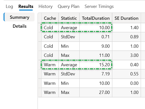 With the results it is quite obvious that my query is taking more time to run in warm cache executions meaning the query is not taking the advantage of the engine cache. Also, since the average duration for cold cache execution is lesser than warm cache executions it means clearing the cache creates an impact on the overall duration. You can follow the detailed table to analyse it in detail.