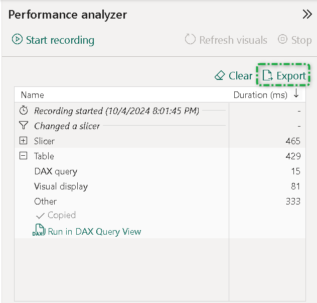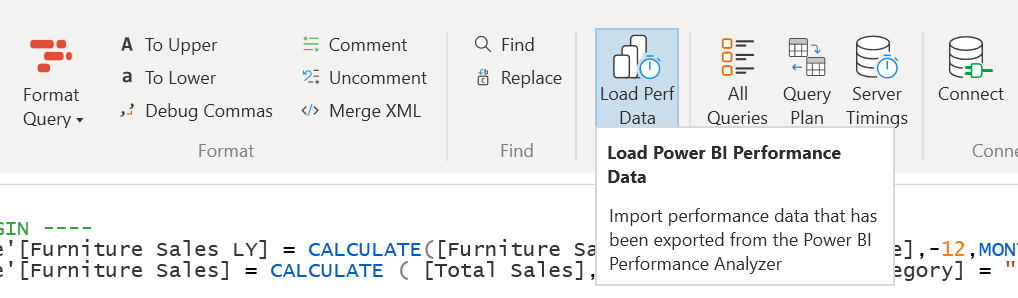 This export will be in JSON format. It's time to switch to DAX Studio and select the load the performance data