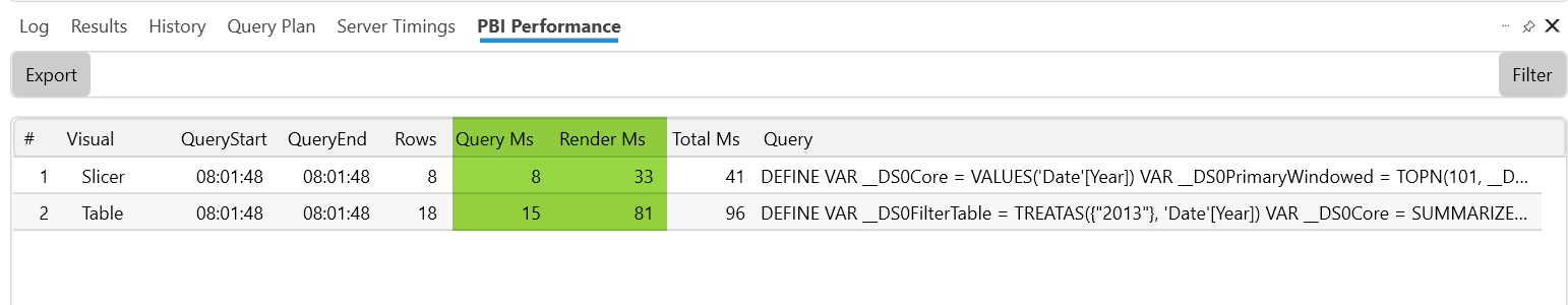 Generally, I go for the Query Ms and render ms columns and select the visual that takes the longest. If you double click on the second query it will open up the complete query. To analyse it in detail go to the Server timings and query plan.