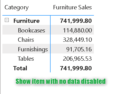 Tackling with blanks in the tables or matrix. There are two ways to do it. To understand in a better way we have created a matrix containing Categories, subcategories and showcasing the furniture sales. If we drag these 3 in a matrix then the other categories won't appear. We avoid the blanks by doing it.