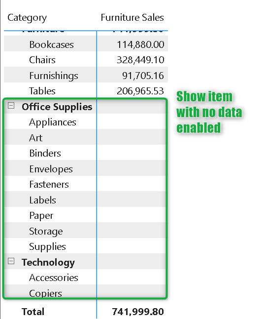 Pro tip: Show item with no data has its own limitations. One of the most common limitation is if the categories and sub categories are coming from 2 separate tables that aren' related then it will lead to an error. To know more about it do visit this article.