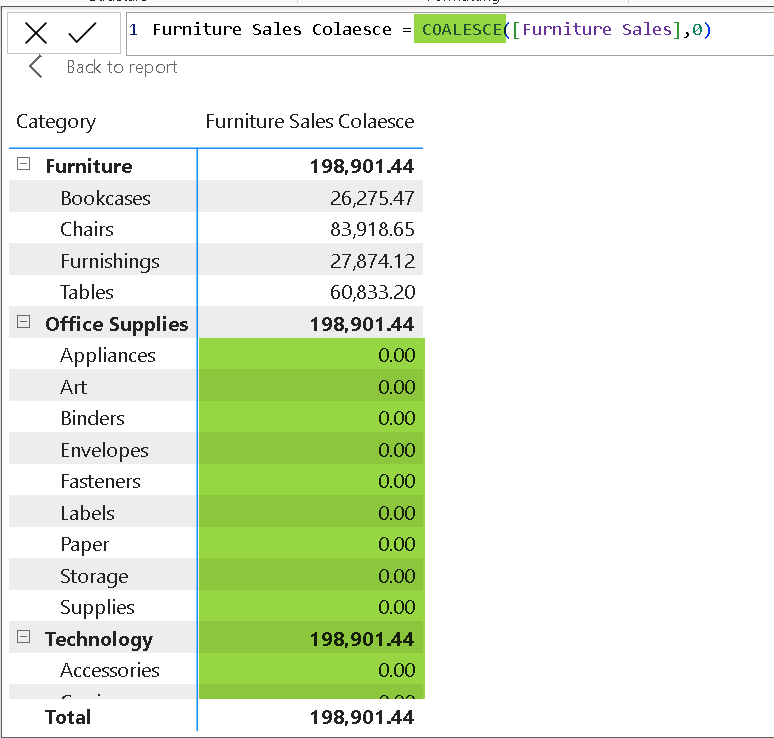 First argument is the furniture sales measure and second argument is 0. You can also provide another measure as second argument. If you do it make sure out of the 2 measures one of them shows some value otherwise the end result will be blank.