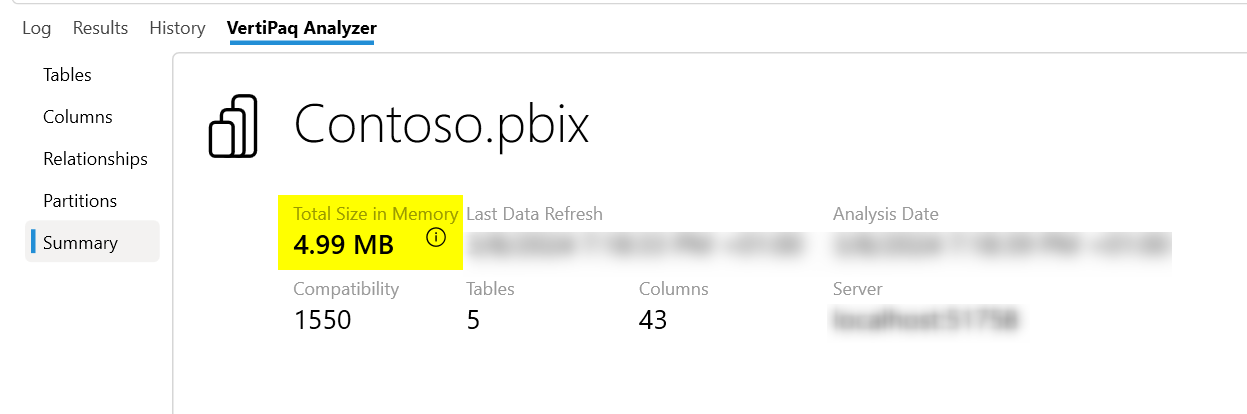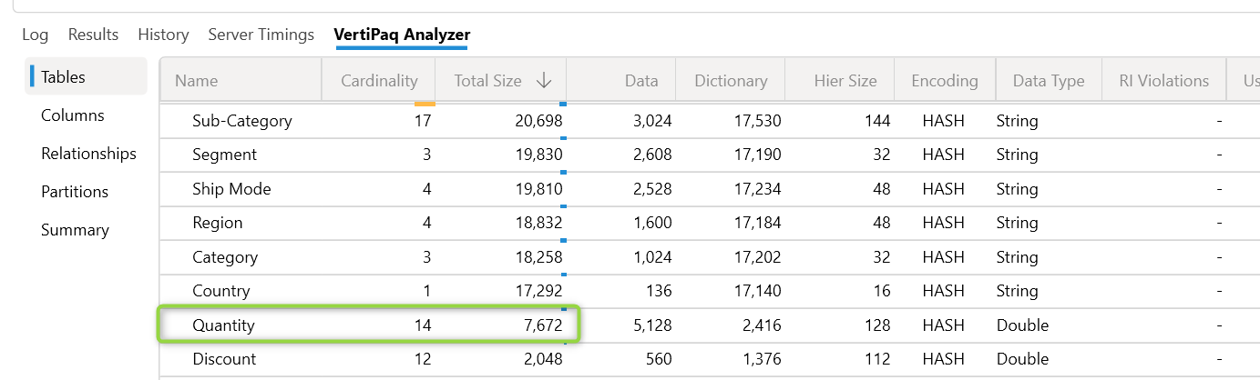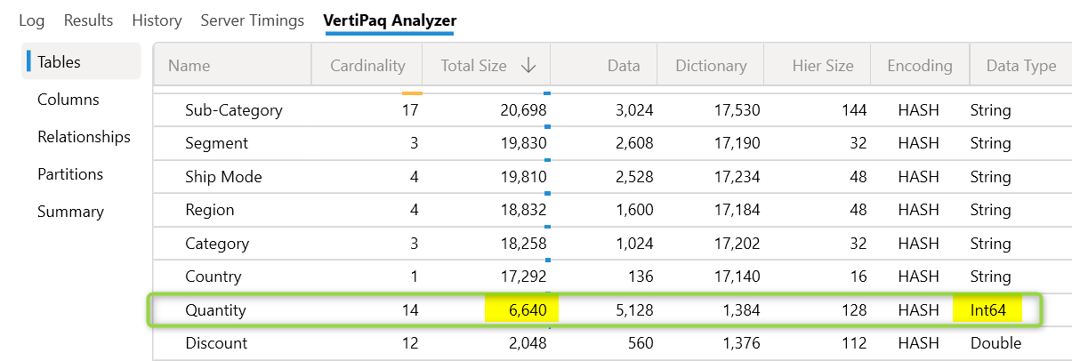How PROs do it? Once you are connected to DAX Studio you can view at a glance in view metrics. In the contoso dataset we have changed the data type for Quantity to decimal number. Let's see how the metrics look with the decimal number data type.