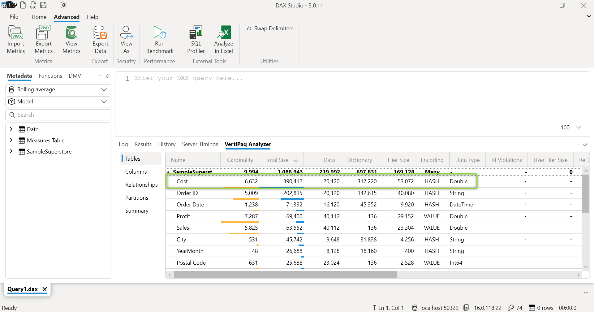 How to identify unused column? You can do it via the help of external tools such as DAX Studio. If you are beginner to DAX Studio then do visit our most visited article on it. You can connect to DAX Studio and view the metrics that will give you this information.