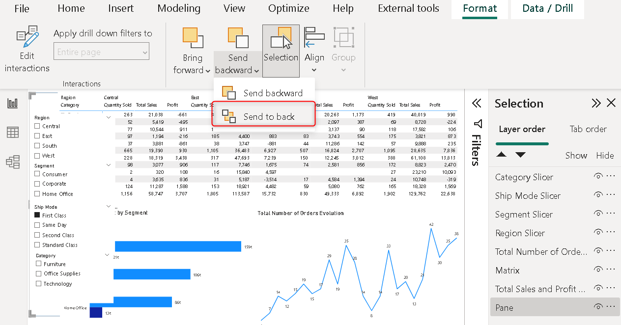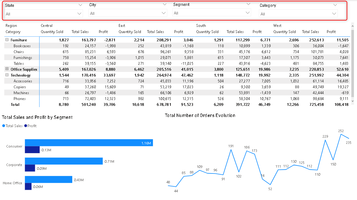 I am considering Sample SuperStore data and I have created a basic dashboard with slicers and other visuals. In the below image, I have put all the slicers on top now we will put all of these slicers into the panel.