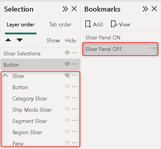 Another bookmark will be the Slicer Panel Off where you can hide the group consisting of all slicers and shapes and also hide the backward arrow.