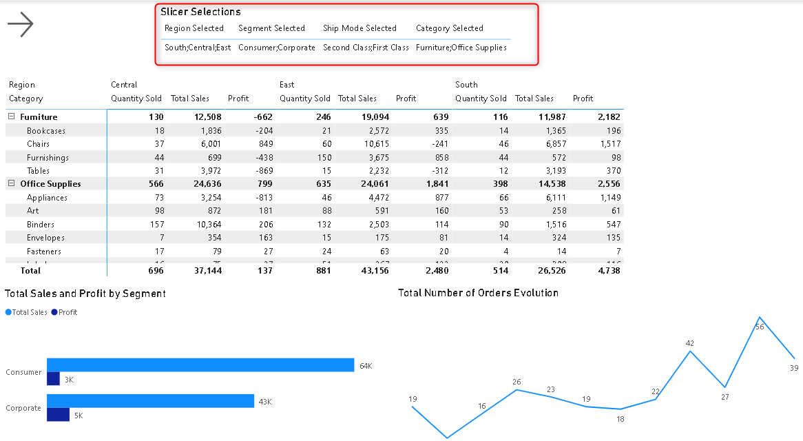We are using ConcatenateX which will help to use iteration on different values of Region in this case and values will provide the list of different values. Also, we are using a delimiter. You can create the same for other slicers as well and put this all in one table.