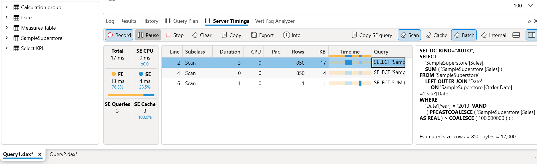 In simpler language FE act as a first layer and execute the DAX query as a rule of thumb do keep an eye on the number of queries generated in both Formula engine (FE) and Storage engine (SE). In this case, we have 3 queries running in background for this DAX. You can check the background query by clicking on every query. Now, let's optimise this by removing the Filter function in the DAX and repeat the same exercise.