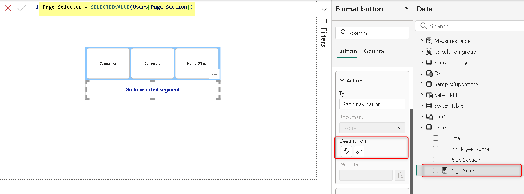 Let's check what we have on the selection page aka landing page. We have mainly 2 things - a button slicer and a blank button leading to different pages. Behind the blank button, we have provided the action for page navigation. To go to the correct page we have created a basic measure with Selected Value. This measure needs to be placed behind the fx in the destination.