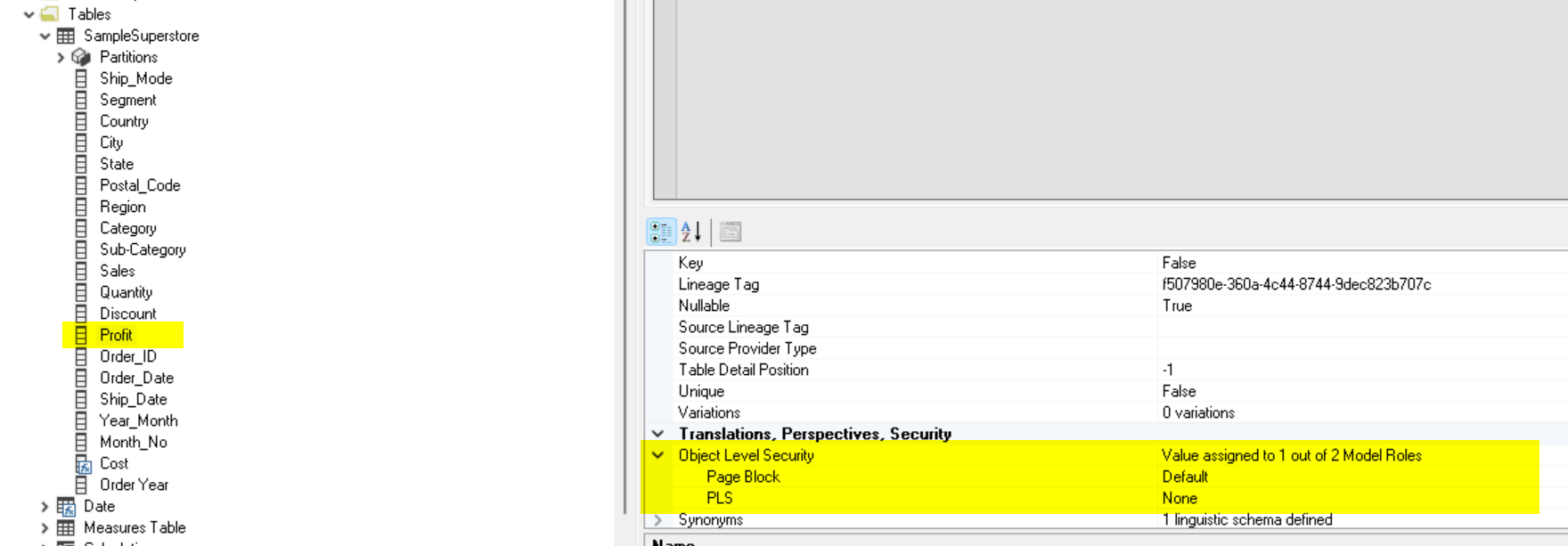 Once you have the new role set up, we would need to go to one of our favorite external tools - Tabular Editor. Head to the column, Profit available in your fact table. Under Object-level security we need to provide a default for the new role - Page block and none for the PLS role.