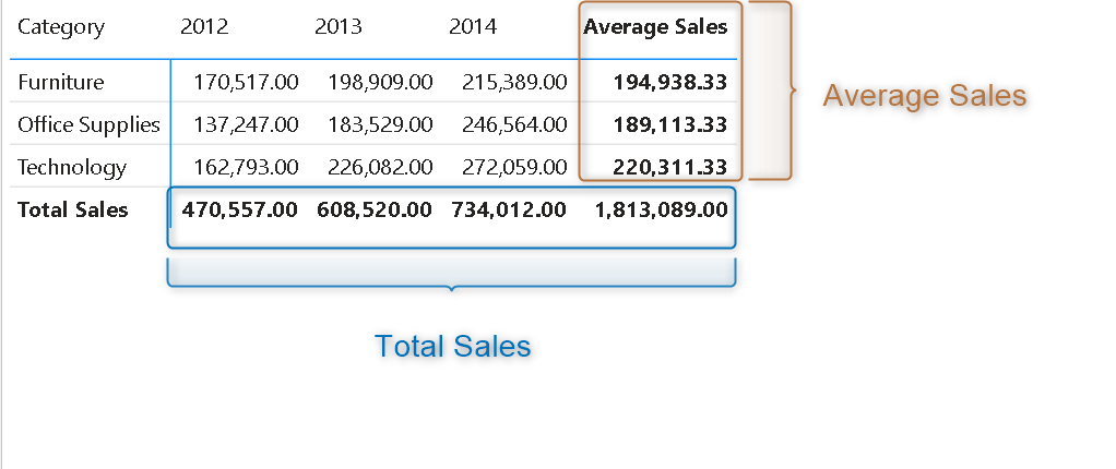 - We would like to show the Average Sales in the row subtotals and Total Sales in the column subtotals.
