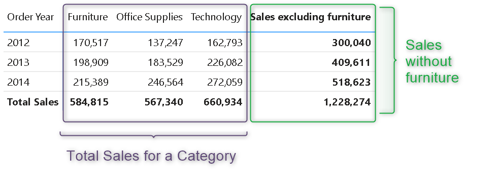 Too much playing with DAX for the day!! Let's do one last scenario, we would like to show the Order year in the row and Categories in the column. Row subtotals should represent the Sales without the furniture category sales and column subtotals should show the total sales.